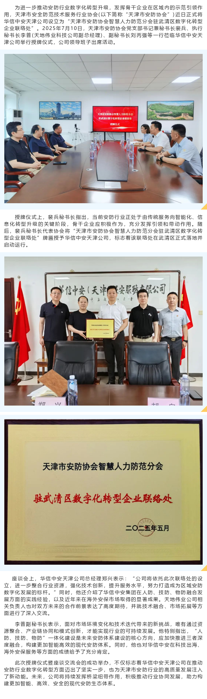 【标杆引领·协同共进】天津市安防协会为华信中安天津公司授牌“数字化转型企业联络处”