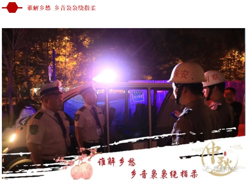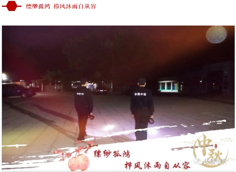 当中秋团圆的月光就这样轻柔地落在城市里每一个角落,当思念追随着十五的月亮奔向远方的亲人,我们的保安员还在通宵达旦值班备勤。节假前查缺补漏,防患于未然;假日中守护安全,身先于一线。他们默默坚守保卫平安,奋战在平凡的岗位上,坚守着心中的一盏灯。保安员,岗位无一时得空,无论春节,何况中秋!执勤无一时有断,不管春夏,何止秋冬!