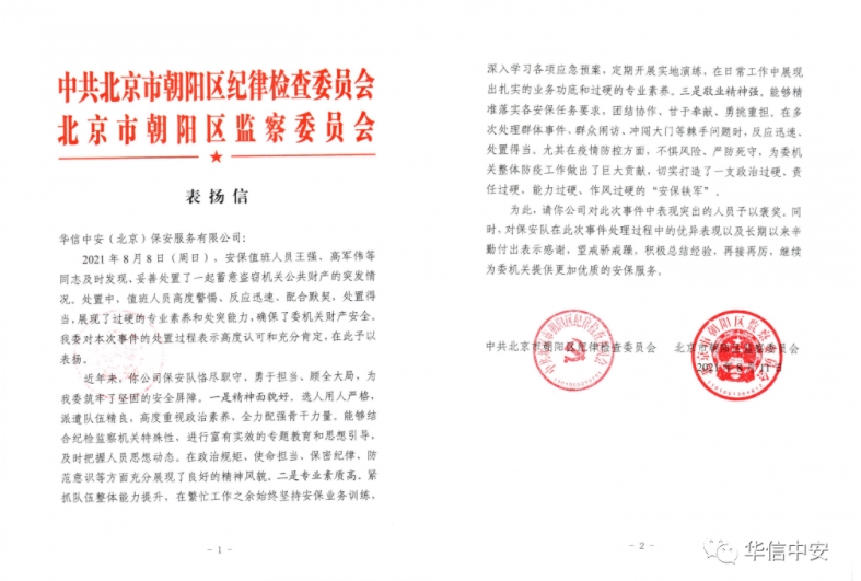 中共北京市朝阳区纪律检查委员会、北京市朝阳区监察委员会向华信中安赠送锦旗感谢信