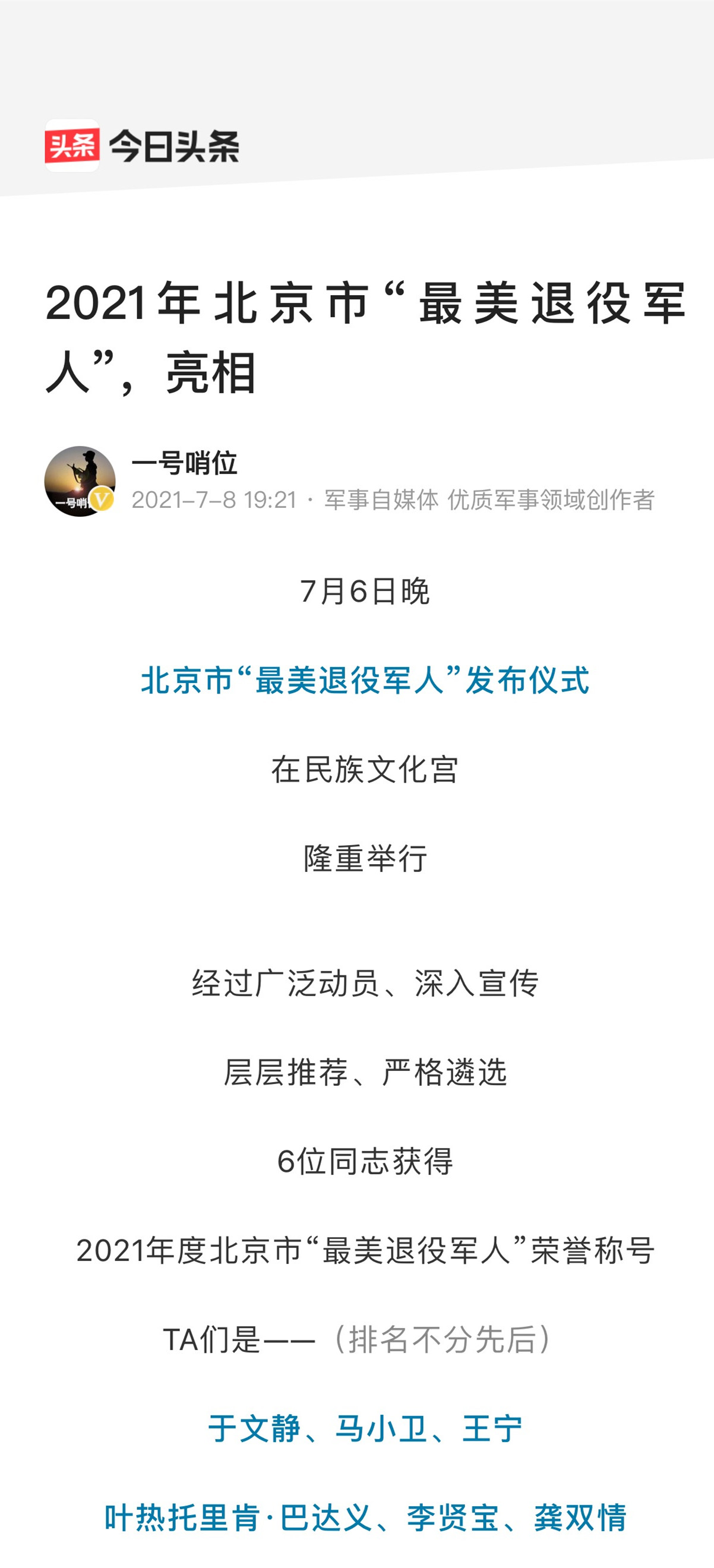 今日头条:2021年北京市"最美退役军人",亮相
