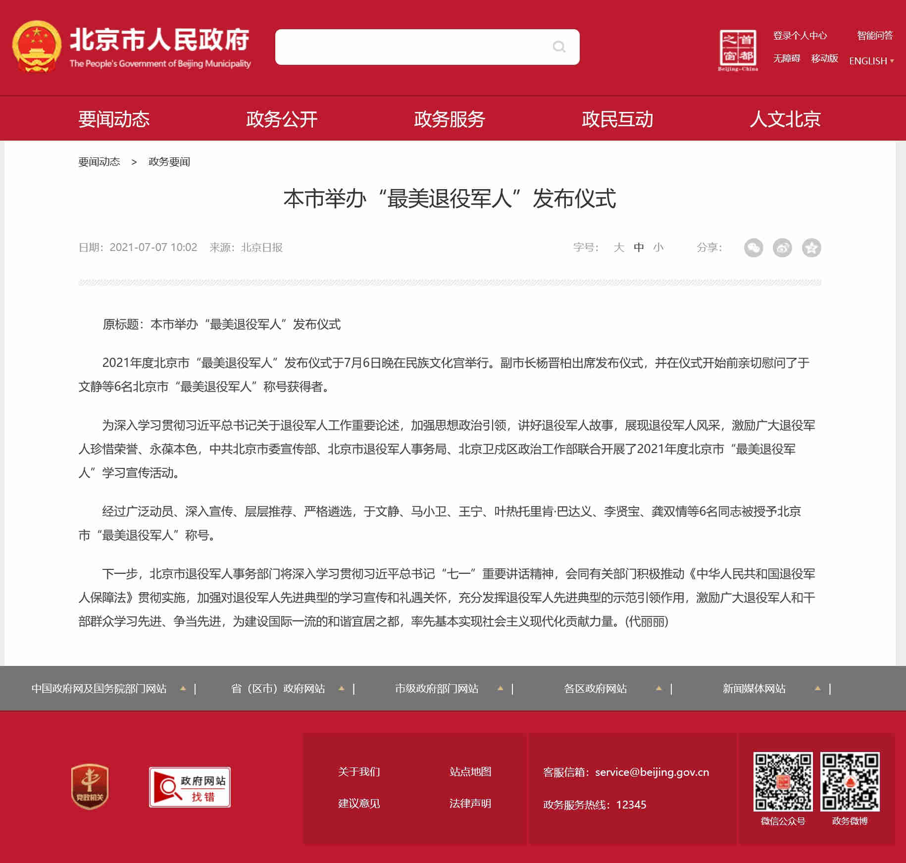 北京市人民政府网:本市举办"最美退役军人"发布仪式
