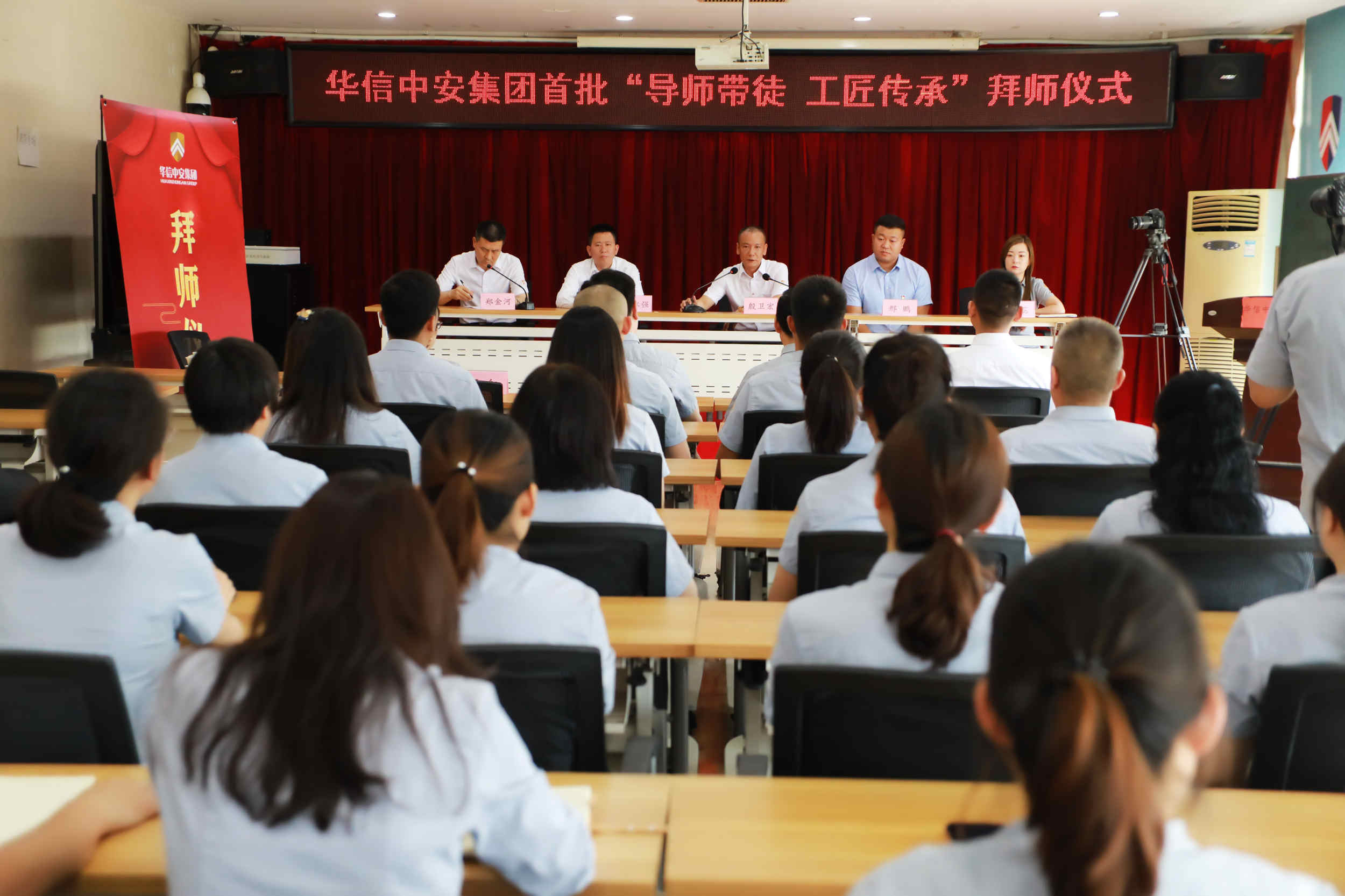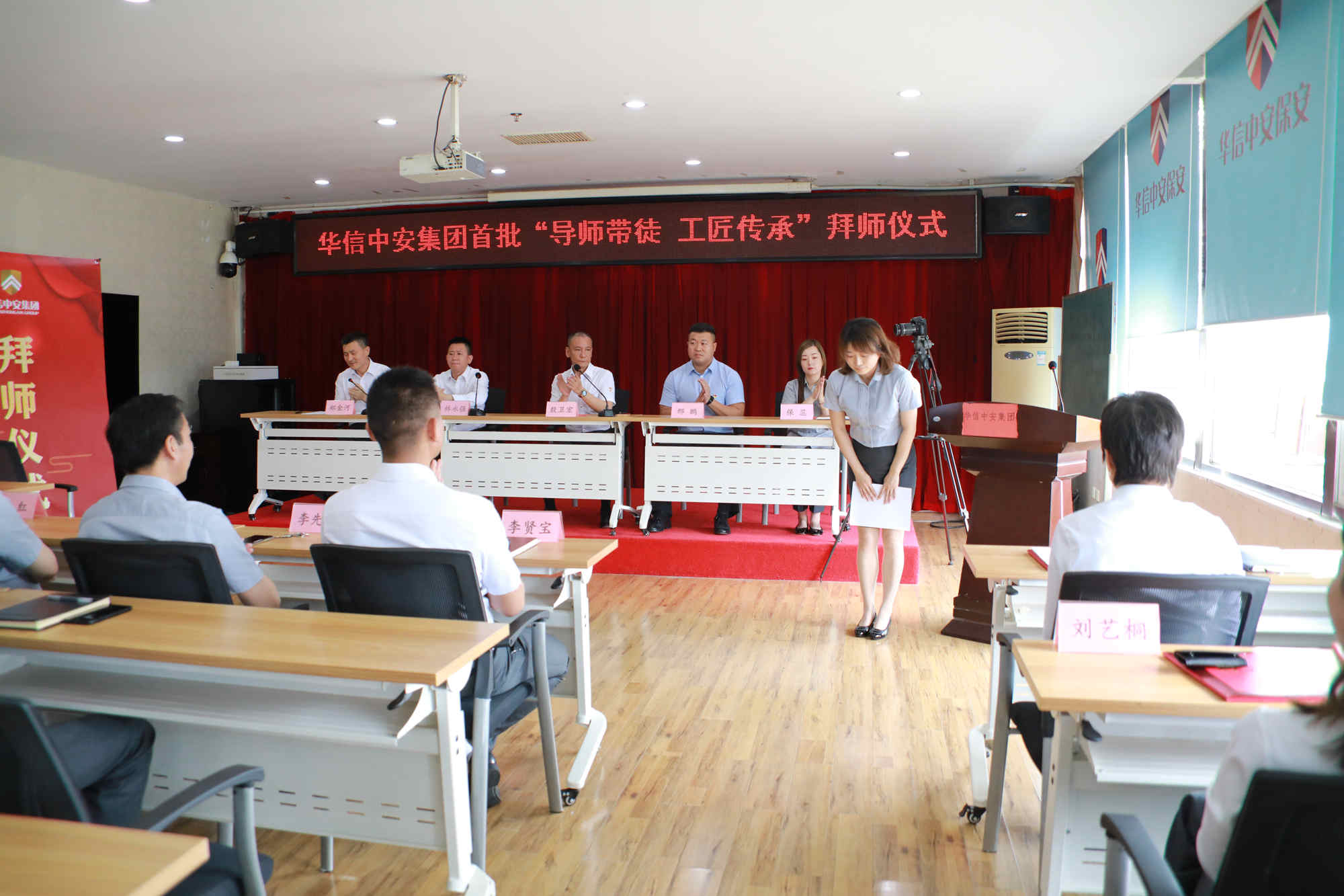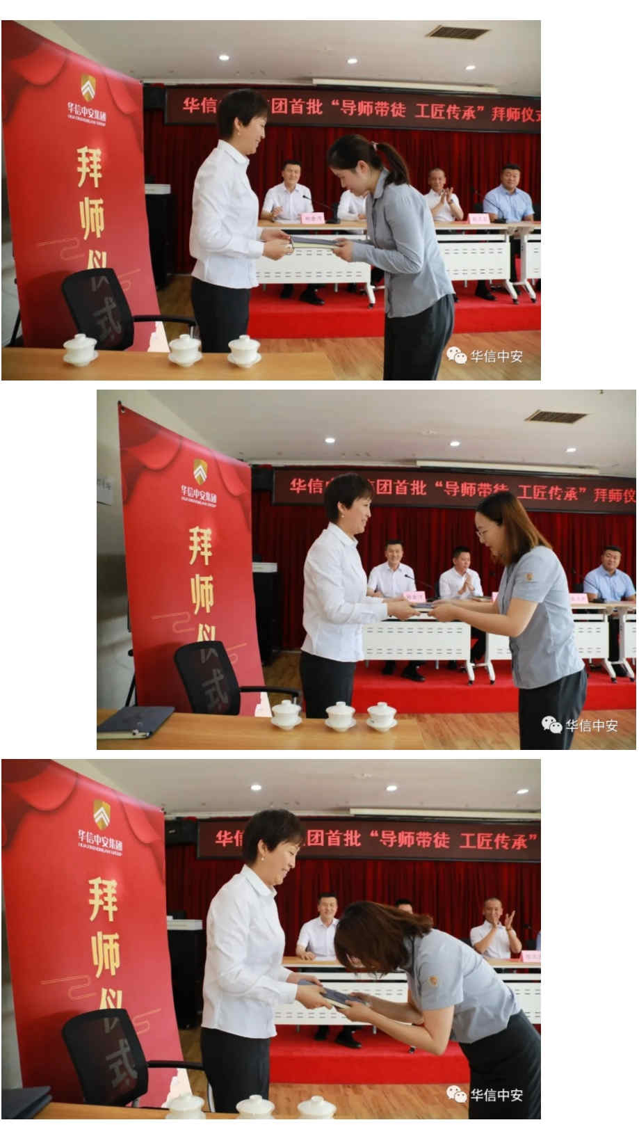 在庄严的国歌声后,拜师仪式正式拉开帷幕。首先,由华信中安党委书记林永强宣读了经过修改完善后的《"导师带徒 工匠传承"师徒管理制度实施方案》,方案中在明确规定了选师范围、选徒范围、带徒周期、师傅竞选程序,进一步明确了师傅和徒弟的责任与权利,学徒出徒的各项要求和出徒的标准。规定师傅职责包括:制订徒弟的学习和培训计划,传授从事本职业所需的理论知识和实操技能,帮助徒弟学习理解各项规章制度、岗位职责、工作方法,保证徒弟能够胜任岗位;帮助徒弟熟悉并适应工作和生活环境,引导徒弟理解并认同企业文化,快速融入公司和团队;关注徒弟的思想动态,从工作、生活上给予关心、爱护和帮助,为人处事起到模范榜样作用,帮助其树立正确的职业发展观;定期向主管领导汇报徒弟的学习进度、工作表现和思想动态,并根据其现实表现向上级提出对其予以调岗、处分、晋升或辞退等合理化建议。徒弟职责包括:遵守法律法规和公司的各项规章制度,安心本职工作,能吃苦耐劳、团结同事,时刻维护公司的利益和荣誉;须树立积极正确的学习工作态度,在工作中服从师傅正常的业务学习安排,认真向师傅学习岗位技能、理论知识和工作方法并加以运用,严格按规范和程序执行工作流程,虚心请教工作中的疑难问题;如发现师傅的培养指导不正确、不合理、不能达到培养效果,经评估可申请更换师傅;对师傅的履职情况给予中肯、客观的评价。