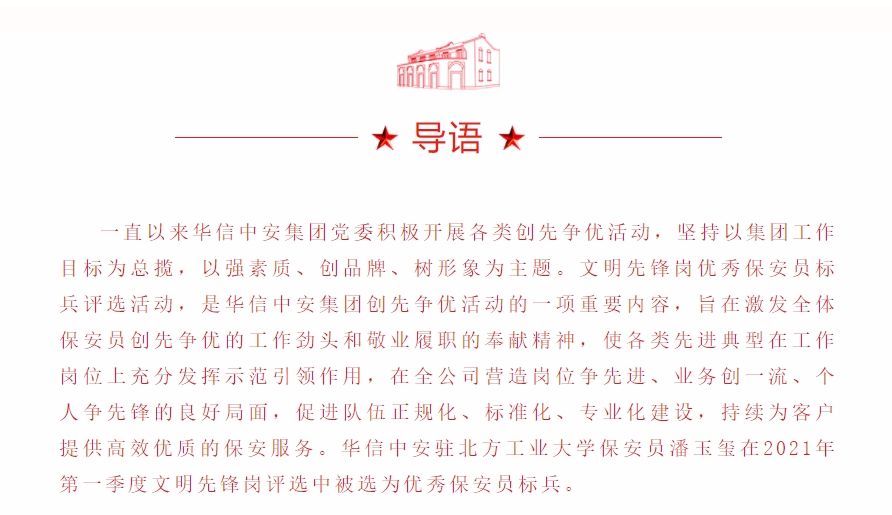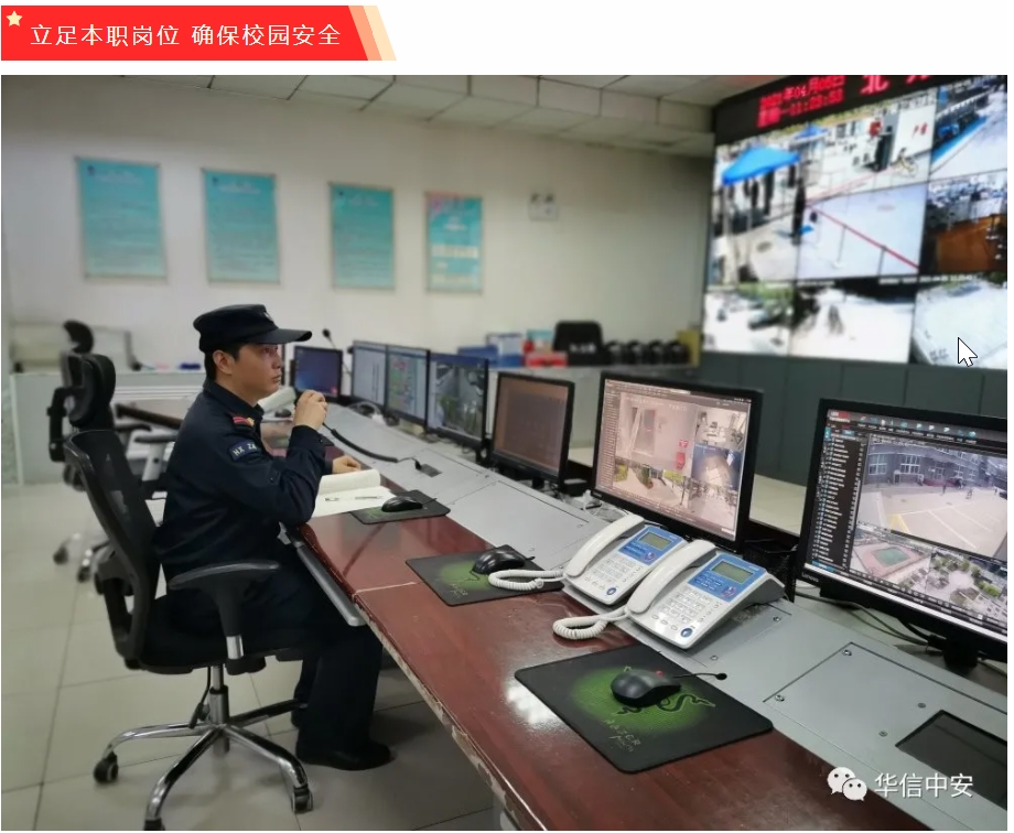 初夏的阳光下,从校园内走出一直队伍,他们排着整齐的队列,迈着矫健的步伐,喊着响亮的口号。校园里的每一份自由、活力与安宁都离不开他们的默默付出,在每一个普通而不平凡的岗位上,在我们看得见或是看不见的地方,无不是他们忙碌的身影。而这支队伍本身也构成了美丽校园里的一道靓丽的风景线。一直以来华信中安驻北方工业大学校警队本着"内强素质、外树形象、严格管理、勇当先锋"的理念,开展各项安全保障工作。在门卫管理、治安巡逻、重点部位看管、校园维稳、大型活动保障、防火防灾防事故中发挥着重要作用,也与校园师生建立了深厚的感情。涌现出许多以校园安全为己任、勤奋工作、积极进取、为学校建设和发展履职尽责提供安全保障的优秀保安员。潘玉玺就是他们中的一员,今年已经是潘玉玺来到华信中安从事保安工作的第四个年头了。