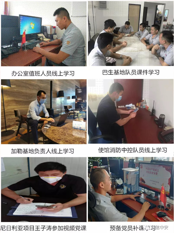 此外在分享党课学习心得体会的同时,海外党支部还充分利用社交软件,开展网络党群座谈会,就疫情防控常态化的条件下,武装护航、使馆消防中控、境外陆地安保等如何更好的开展工作,党员如何发挥好先锋模范作用,群众如何向先进模范看齐,更好的在实际工作中做出应有的贡献等问题展开了交流讨论。